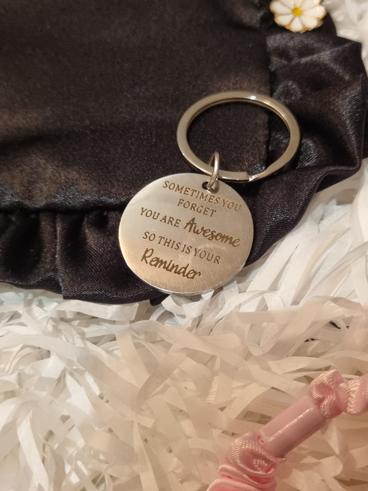 – A round metallic keychain engraved with a motivational message: “Sometimes you forget you are awesome, so this is your reminder.”