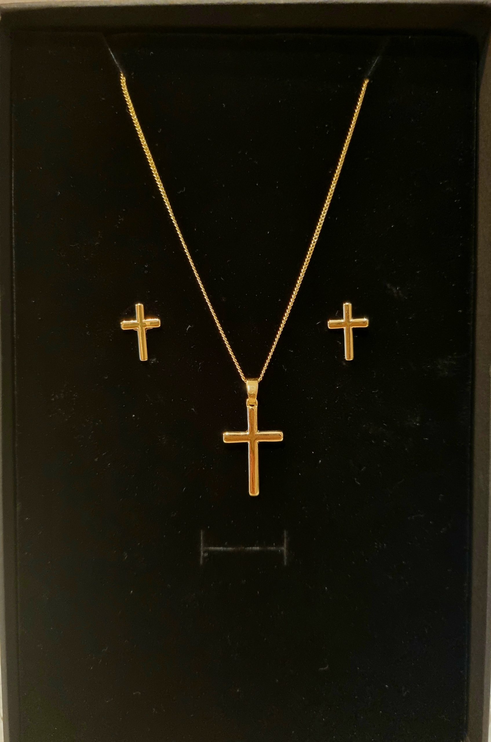 A plain yet elegant gold-toned cross necklace with matching earrings — timeless simplicity that shines with understated beauty. Remember we can personalize this gift box to make this gift extra special💛