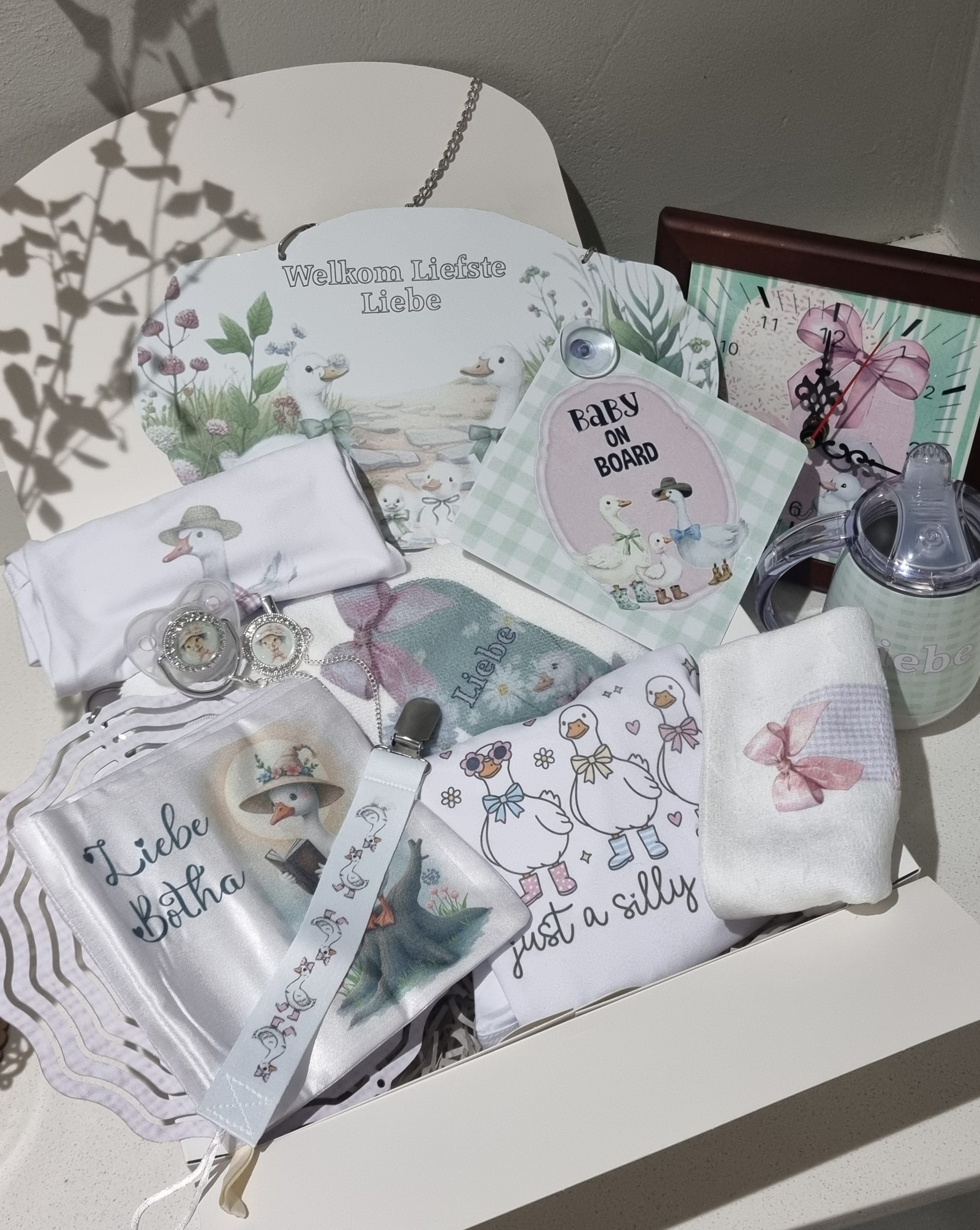 Each piece is sublimation printed in your chosen colour and theme, making this hamper as unique as the baby it honours. Presented in a personalised gift box, it’s ready to give.